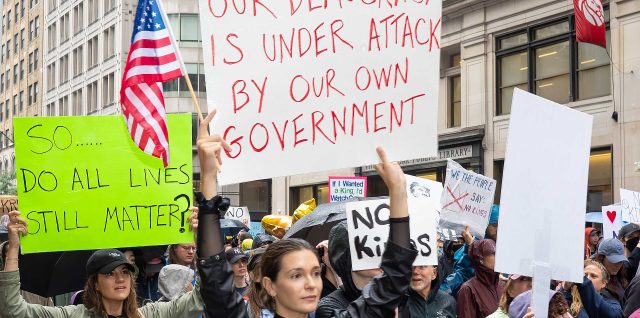 Mimi Rosenberg – All right, this is the Big Apple. So folks, we just missed a moment ago. People who were here, Robert De Niro was here, and State Attorney General, Letitia James, people are on the move, on the March now. They’re glad to be because it really is quite chilly, but the spirits are enormously warm, and the signs that are here are very diverse, so now we got one due process for everyone. Imagine being afraid of diversity, but not dictatorship. Can you tell us why you have that sign?